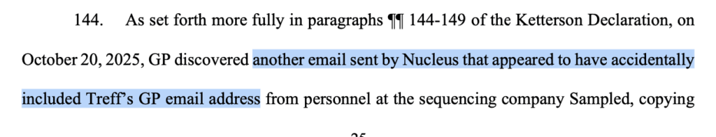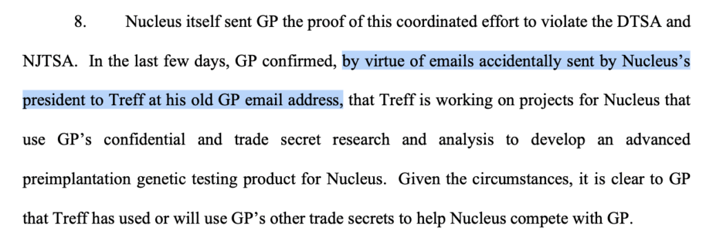 Reading the full complaint in Genomic Prediction Inc. v. Treff et al. is quite illuminating. It appears that GP first became aware of their (allegedly) duplicitous actions from … the Nucleus president sending emails to Treff’s old GP email address after his departure.