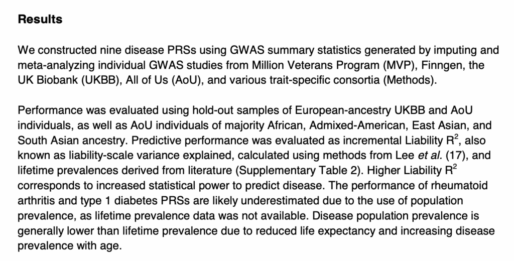 First, both papers construct polygenic scores for a range of diseases. As mentioned previously, Nucleus Origin uses SBayesRC, which is a method previously described in the literature that helps account for linkage disequilibrium and cross-ancestry differences. Unsurprisingly, so does Herasight, and the exact steps of their analysis move almost in lockstep. Nucleus first uses SBayesRC to impute summary statistics, secondly meta-analyzes them with inverse variance weighting, and thirdly uses SBayesRC to directly compute the PRSes: