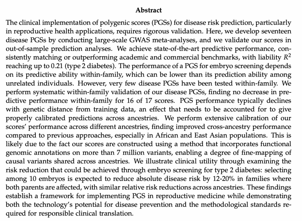 Upon closer examination, the entirety of the Origin paper seems to be a sloppy near-duplicate of a preprint by Herasight, a competing embryo selection company, that was posted on August 8, 2025. Both papers construct PRSs and validate them within-family and across ancestries in very similar ways. Both papers report the same types of statistics in the same visual formats. Both papers cite the same literature and use the same analytic methodology. It’s just that the Herasight paper was posted 3 months before Nucleus Origin.