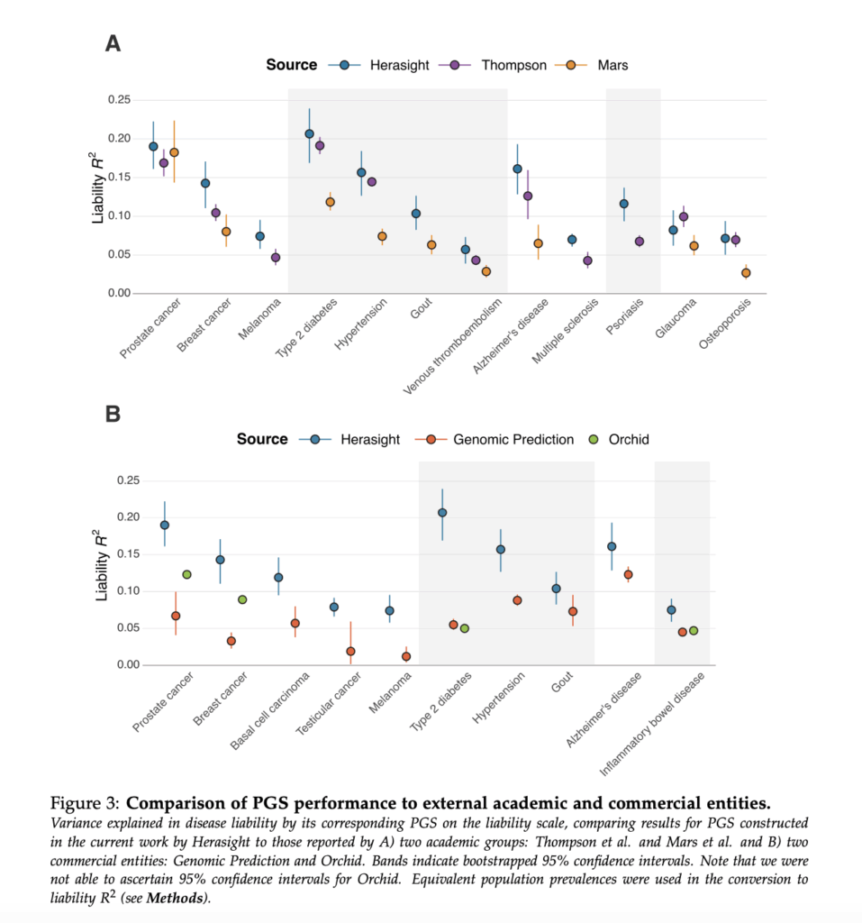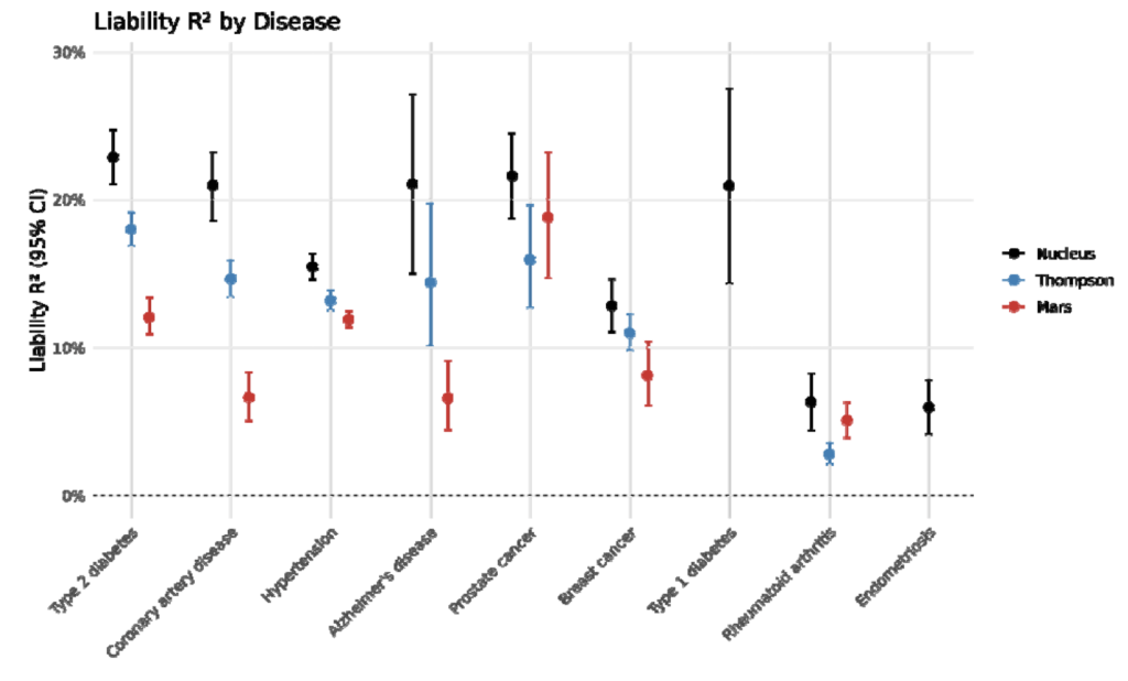 Next, both Nucleus and Herasight compute liability R2 for these diseases and compare their results to the same known literature values (specifically, papers by Thompson and Mars).