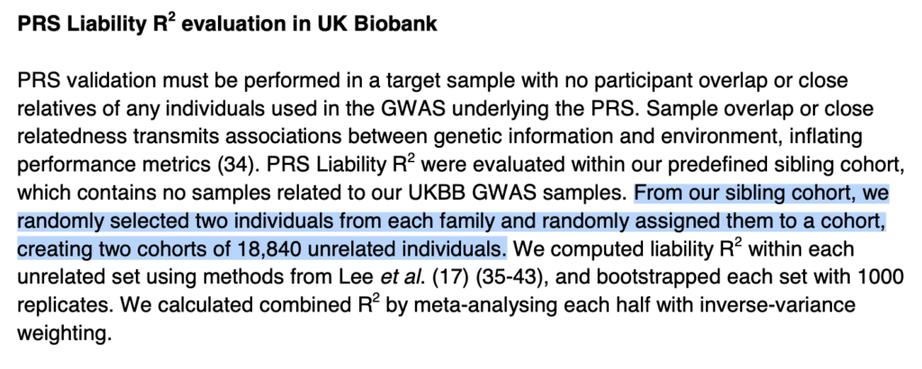 But in practically the same breath, they’ve described the construction of their PRS sibling validation set as being directly drawn from the training cohort they described on the previous page! And to make matters worse, because the two halves (in their validation set construction method) contain siblings from the same families, the two estimates of liability R2 obtained on each half are not independent in the typical sense, introducing bias into their inverse-variance-weighted meta-analysis.