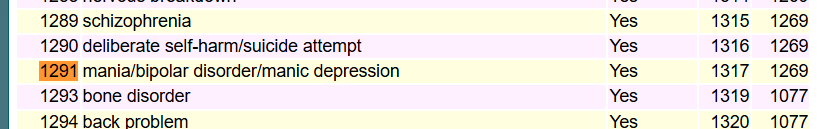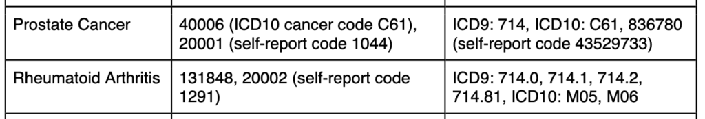 They also duplicated the rheumatoid arthritis UKB code 131848 for type 1 diabetes and reported UKB’s self-report code 1291 for “mania/bipolar disorder/manic depression” for rheumatoid arthritis and type 1 diabetes: