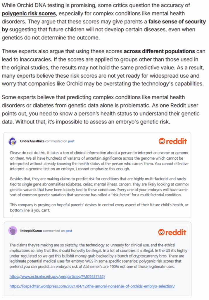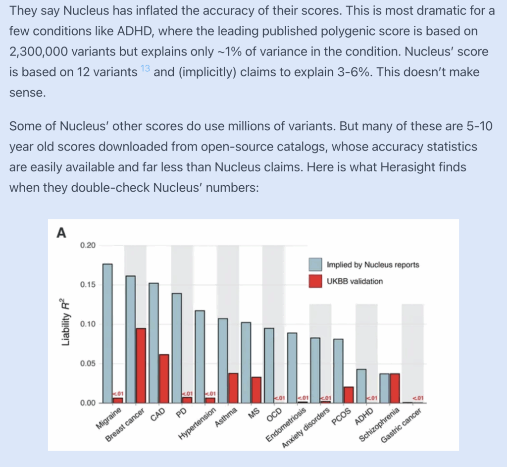 How do I know that this happened? Well, before they started offering their IVF product, they published a review of Orchid Health, a competitor which also offers polygenic embryo screening, where Nucleus actually includes a theoretical critique of polygenic risk scores: