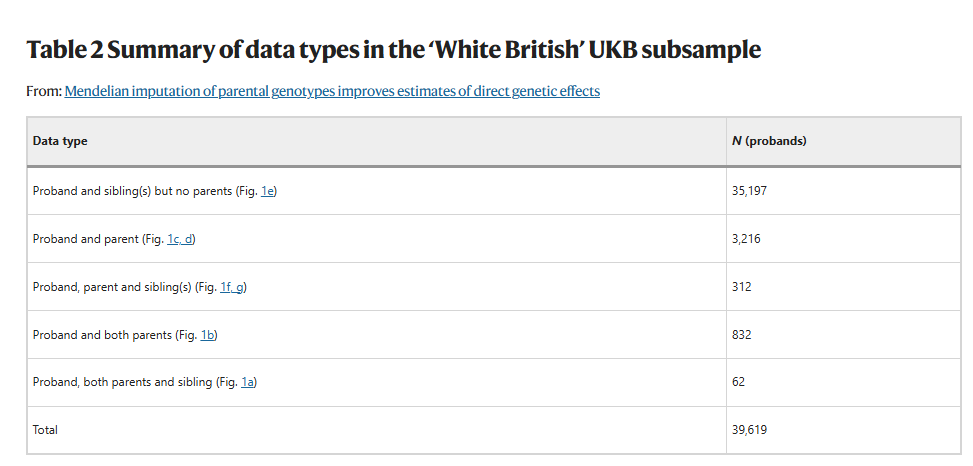 Related to the above is the possibility that the sibling testing (training?) does not include only siblings but other relationship types as well. For background, a proband is defined as “a person serving as the starting point for the genetic study of a family.” As Herasight’s paper mentions, this includes both people in a sibling pair as well as any offspring of parents also genotyped in the UK Biobank; Herasight uses such probands for within-family validation in the UKB. The citation to Young et al., which develops the relevant within-family methods, shows the available numbers: