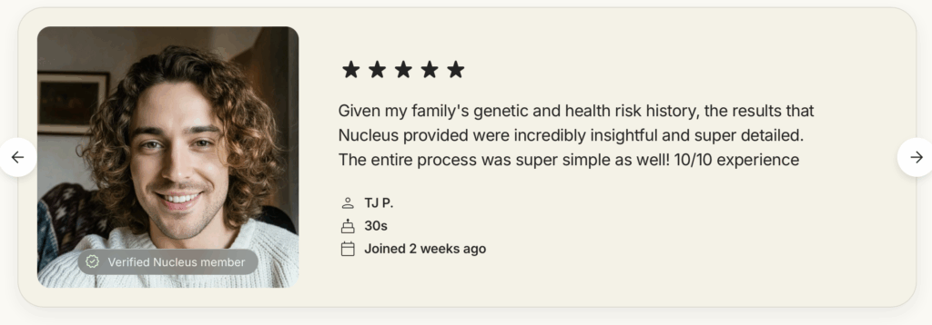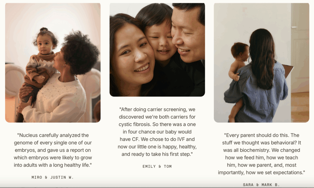 It is chronologically impossible for these reviews to be true because Nucleus started offering carrier screening in the spring of 2025 and their IVF product in May 2025. It is currently November 2025, meaning that no couple could have even gone through carrier screening and IVF with Nucleus and had a successful conception at the time of writing, let alone produce a child mature enough to walk or grow a full head of hair.